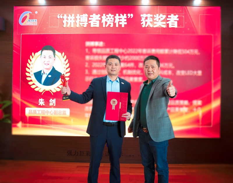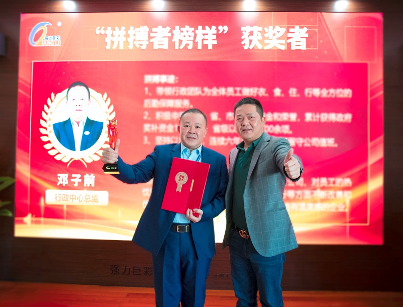 颁奖仪式上,朱志强董事长代表公司向所有获选拼搏者表示祝贺。他强调,2022年是不平凡的一年,但公司依然取得可圈可点的成绩,这与全体同仁的拼搏精神息息相关。今天我们见证新一批拼搏者的当选,也期待未来有更多新的拼搏者涌现出来,让我们的拼搏者队伍越来越壮大,助力强力巨彩向“创世界级伟大公司”的宏伟愿景前进!