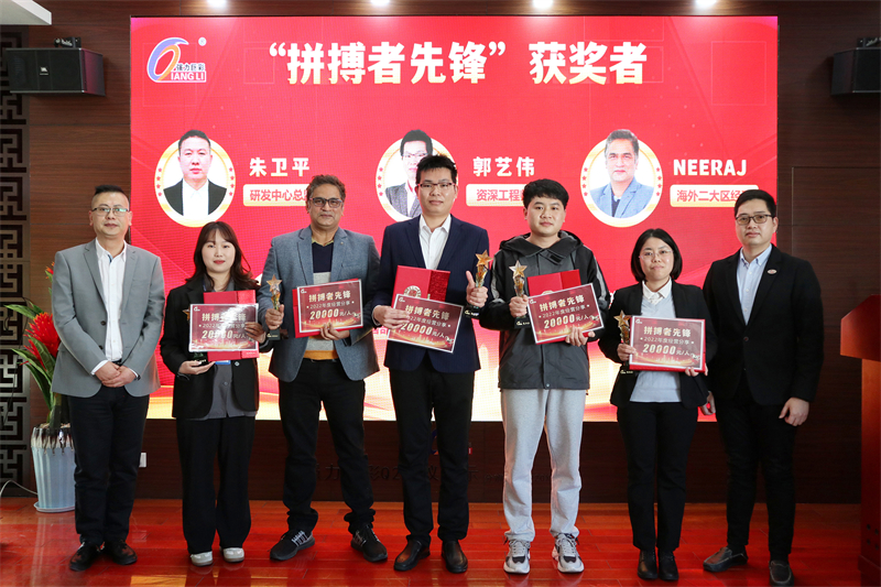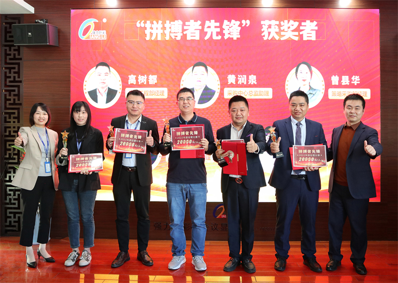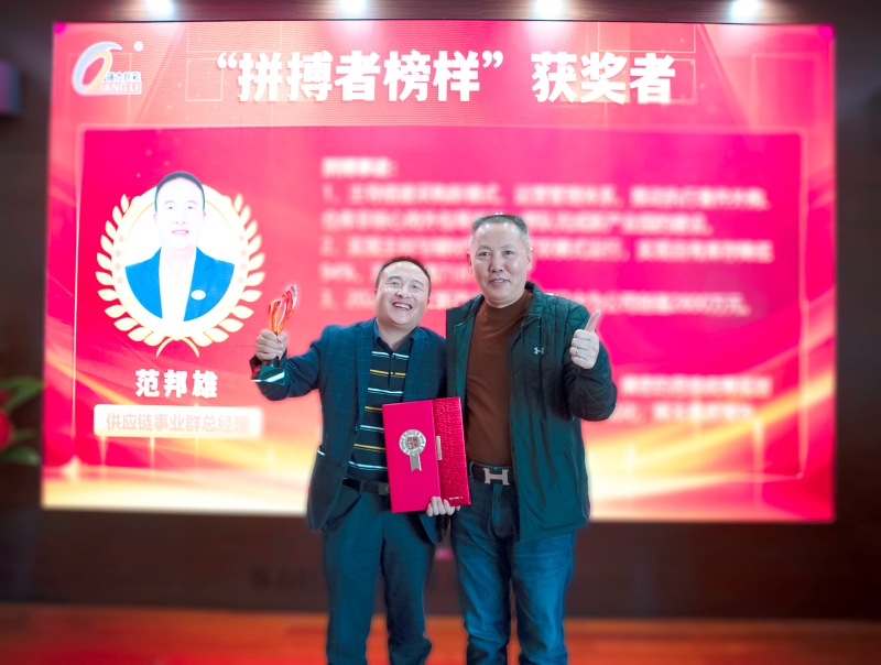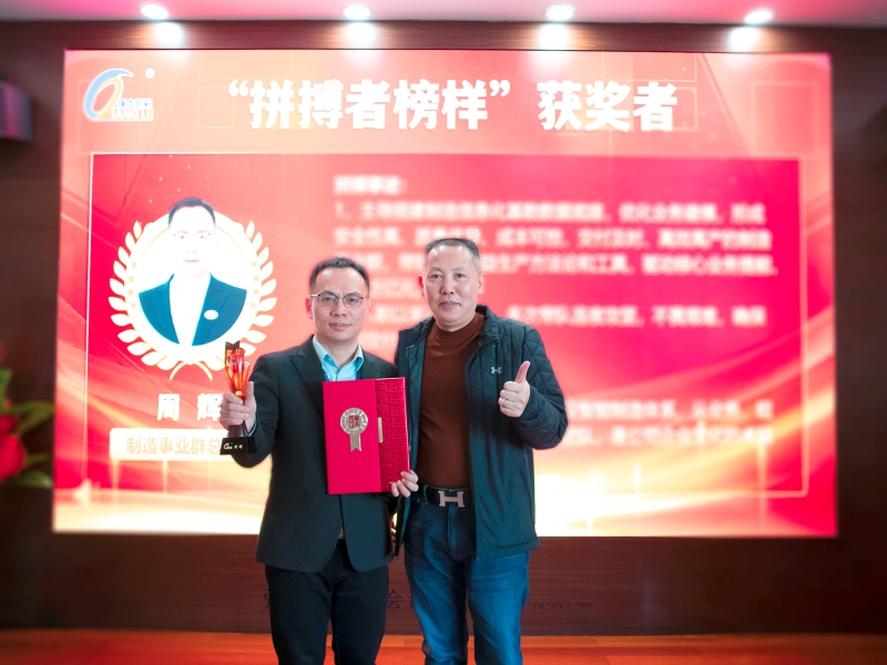 随后,朱董、周董向5名“拼搏者榜样”颁发奖杯与奖状,分享此刻荣耀与丰硕成果,激励他们接续拼搏,以高昂的热情投入未来的经营管理当中。